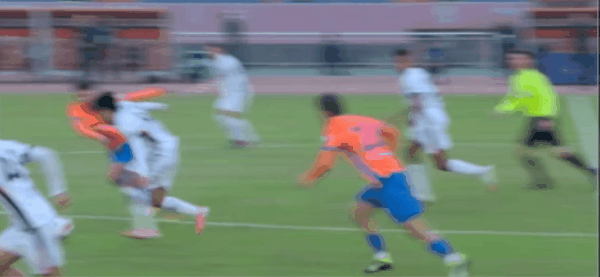 50' Taishan chuyền bóng từ cánh phải vào vòng cấm, Cresan chồm người về phía trước và chạm xà ngang