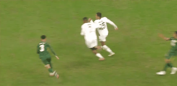 42’ Zhang Yuning bị đối thủ rê bóng dưới háng làm nhục, Fabio lao vào đẩy đối thủ cho đồng đội
