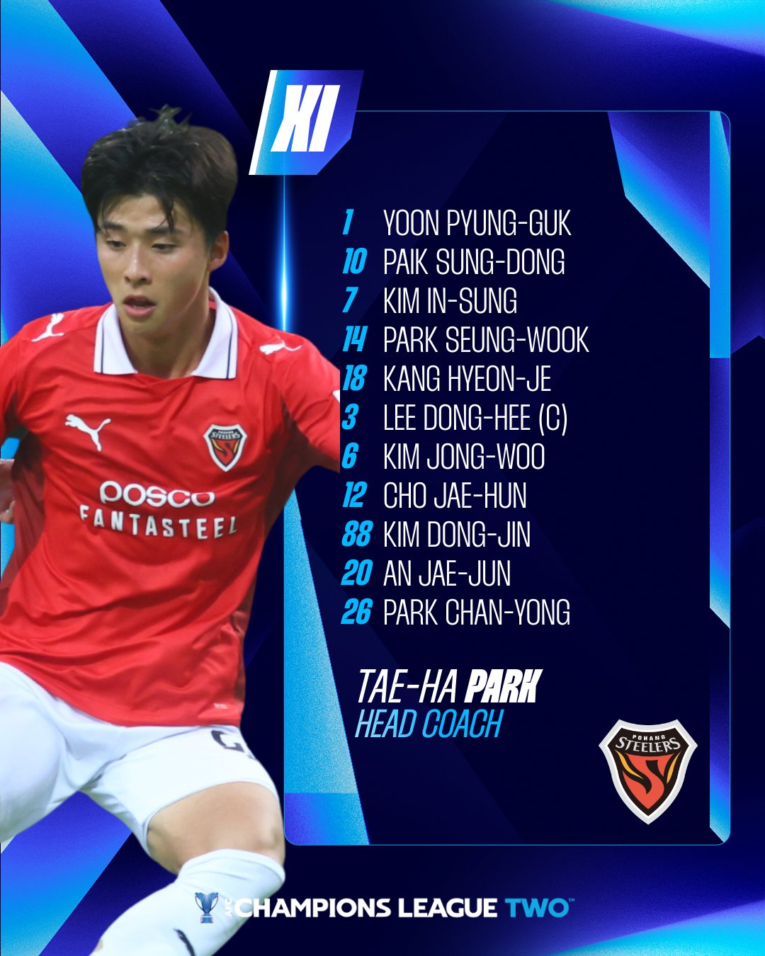 Đội hình xuất phát của Pohang Ironman:1-Yin Pyong-guk, 7-Kim In-sung, 10-Baek Seong-dong, 14-Park Seung-woo, 6-Kim Jong-woo, 3-Lee Dong-hee, 12-Cho Jae-hoon, 18-Kang Hyun-tik, 26-Park Chan-yong, 20-Ahn Jae-joon, 88-Kim Dong-jin