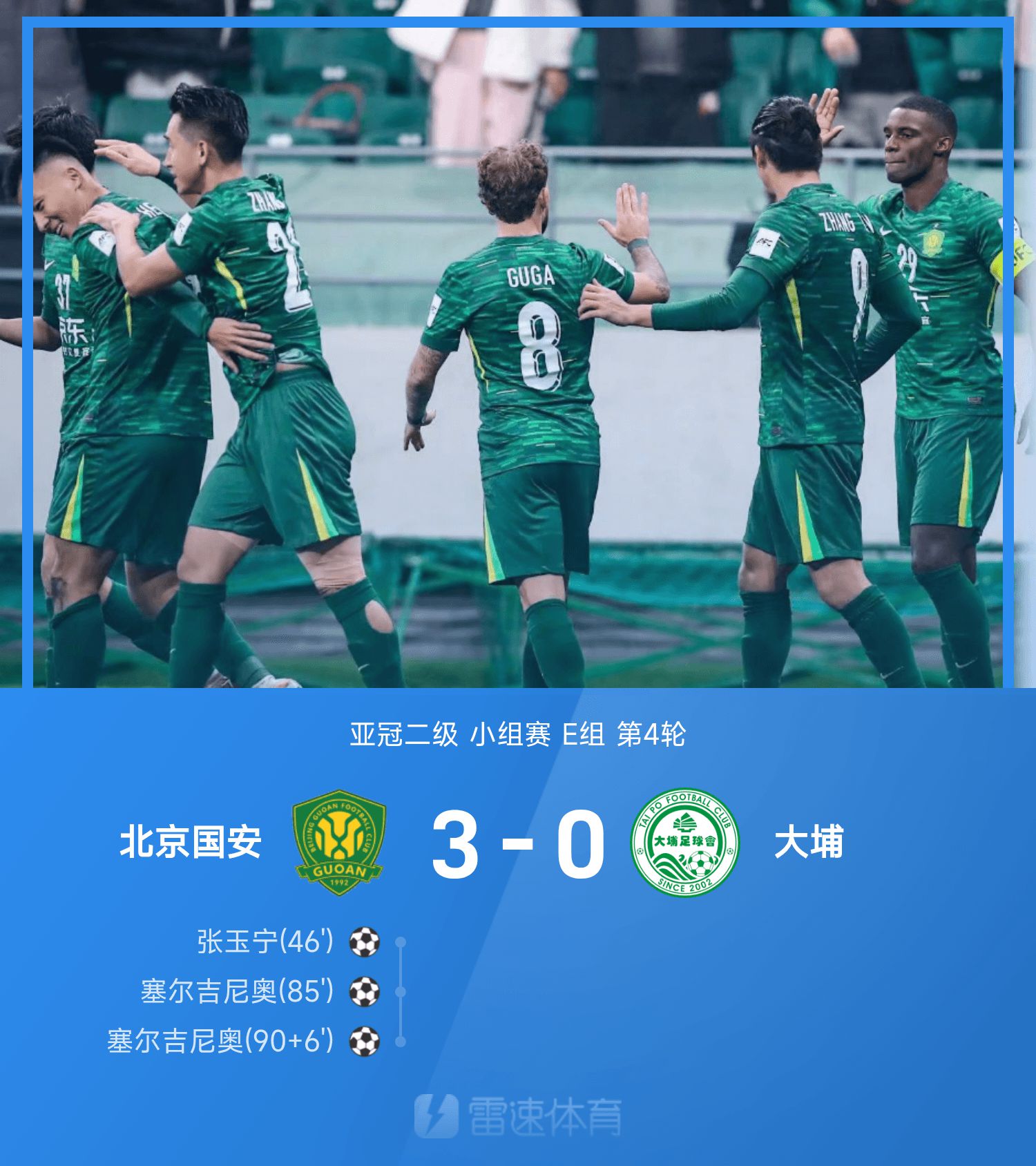 6686 Sports đưa tin ngày 6/11 rằng ở lượt trận thứ 4 bảng E của trận đấu hạng hai AFC Champions League vòng 25/26, Beijing Guoan đã đánh bại Dabu với tỷ số 3-0. Trong hiệp một, không đội nào lập được thành tích nào và thủ môn Zhang Jianzhi của Guoan suýt chút nữa đã tặng quà; Chỉ một phút trong hiệp hai, Zhang Yuning đã khai thông thế bế tắc cho Guoan, và sau đó Serginho, người vào sân với tư cách cầu thủ dự bị, đã ghi hai bàn, trong đó có một bàn thắng ấn tượng. Chung cuộc, Beijing Guoan đã đánh bại Dabu 3-0 để lần đầu tiên vô địch AFC Champions League mùa này, đồng thời thoát khỏi vị trí cuối bảng và tiến lên vị trí thứ ba.