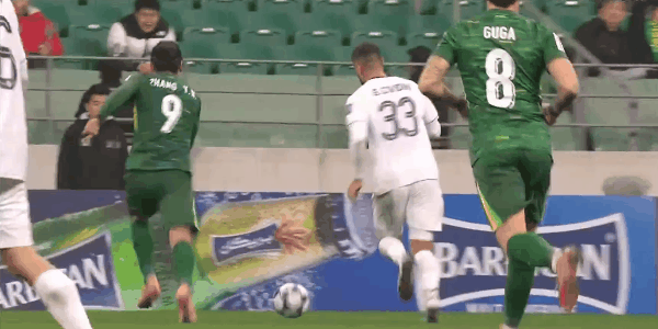 45' Những đường chuyền liên tục của Guoan đã gây ra sự hỗn loạn trước khung thành Taipu và Fabio đã có một cú húc ngang khung thành