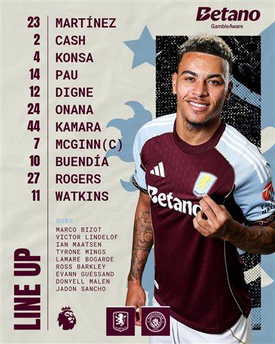 Đội hình xuất phát của Aston Villa: 23-Martinez, 12-Digne, 4-Konsa, 2-Kash, 14-Torres, 7-McGin, 10-Buendia, 44-Kamara, 24-Onana, 27-Rogers, 11-Watkins