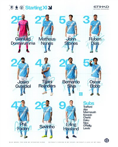 Đội hình xuất phát của Manchester City: 25-Donnaruma, 5-Stones, 3-Dias, 27-Nunez, 24-Gvadiol, ghế 20-B, 47-Foden, 4-Reinders, 26-Saviho, 52-Bob, 9-Haaland