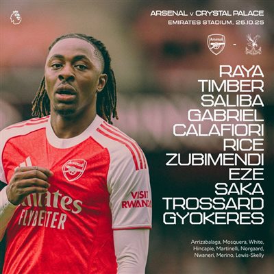 Đội hình xuất phát Arsenal vs Crystal Palace: Eze vs. CLB cũ, Dzekeresh và Guey đá chính