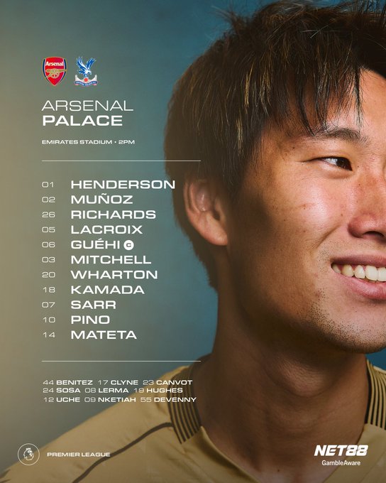 Đội hình xuất phát của Crystal Palace: 1-Dean Henderson, 2-Munoz, 3-Mitchell, 6-Guey, 5-Lacroix, 26-Richards, 18-Kamada Daichi, 20-Wharton, 7-Sar, 10-Pino, 14-Matteta
