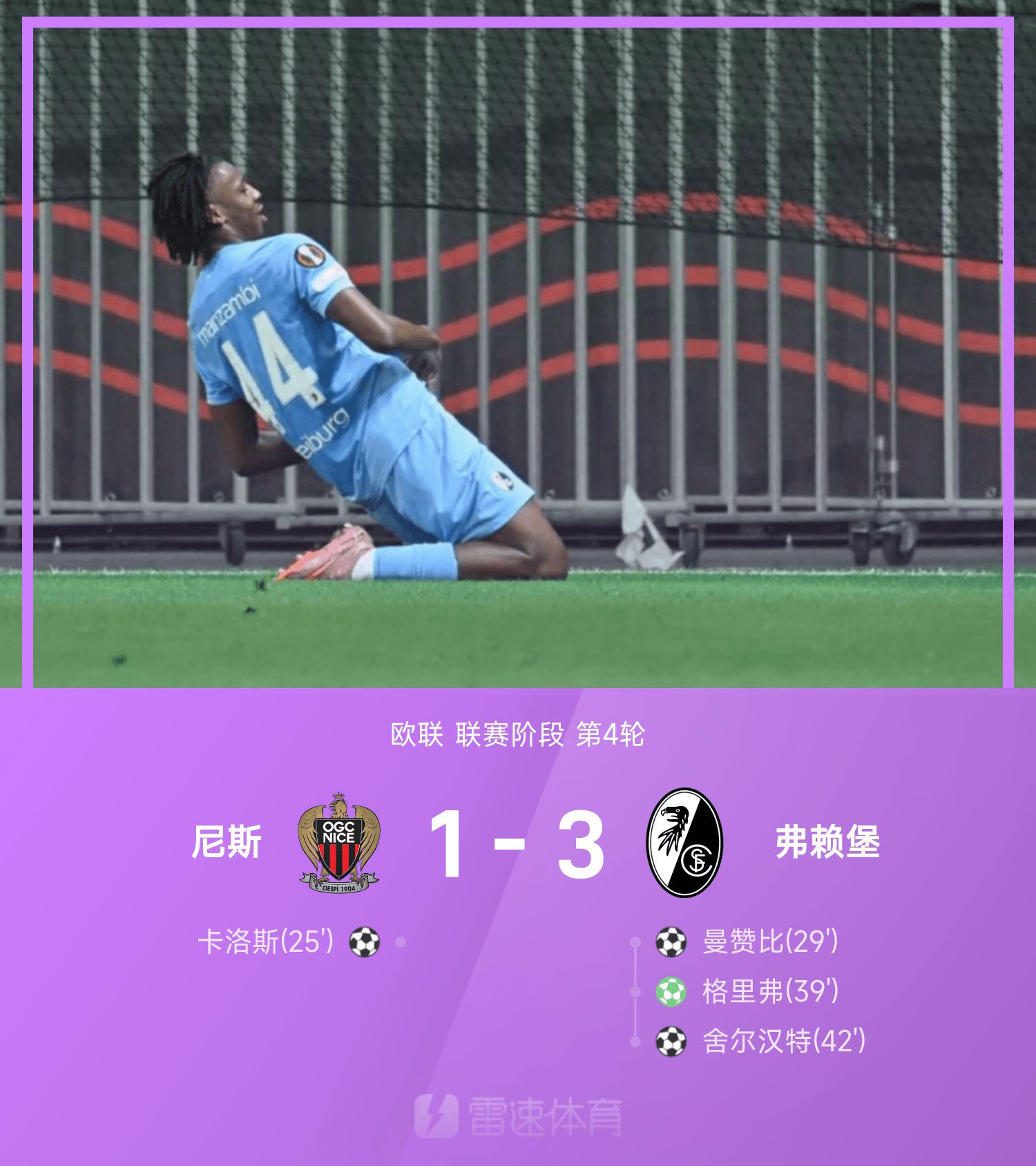 6686 Sports đưa tin ngày 7/11 rằng ở vòng 4 Europa League 25-26, đội chủ nhà Nice gặp Freiburg. Trong nửa đầu mùa giải này, Carlos ghi bàn thắng đầu tiên chỉ bằng một cú sút duy nhất, Manzambi thực hiện cú vô lê cân bằng tỷ số, Grifo thực hiện quả phạt đền từ cự ly 12m, và Sherhant ghi một bàn thắng khác từ góc xa. Sau khi đổi bên và đánh nhau một lần nữa, không bên nào ghi được bàn thắng. Kết thúc trận đấu, Freiburg đánh bại Nice với tỷ số 3-1.