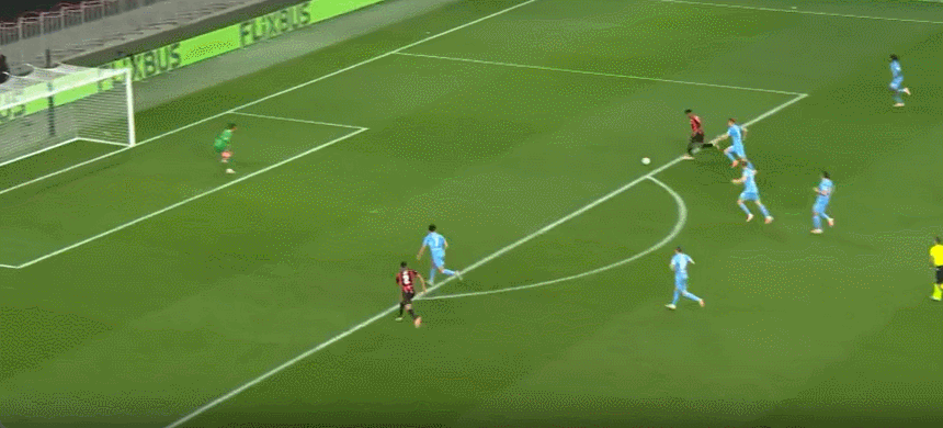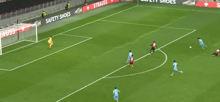 63' Nice bao vây đối thủ, Govia lốp bóng vọt xà ngang, và Samed tiếp theo bằng cú sút cao hơn xà ngang một chút