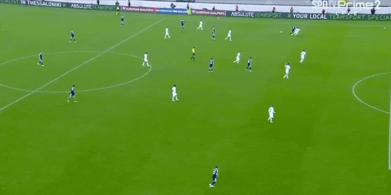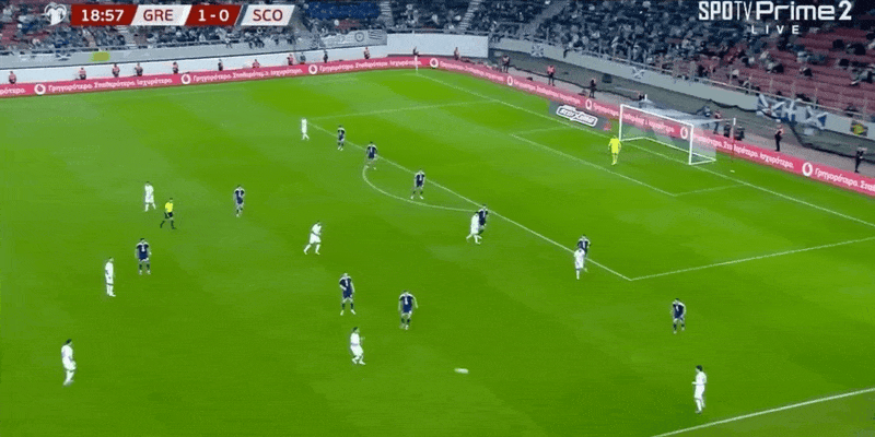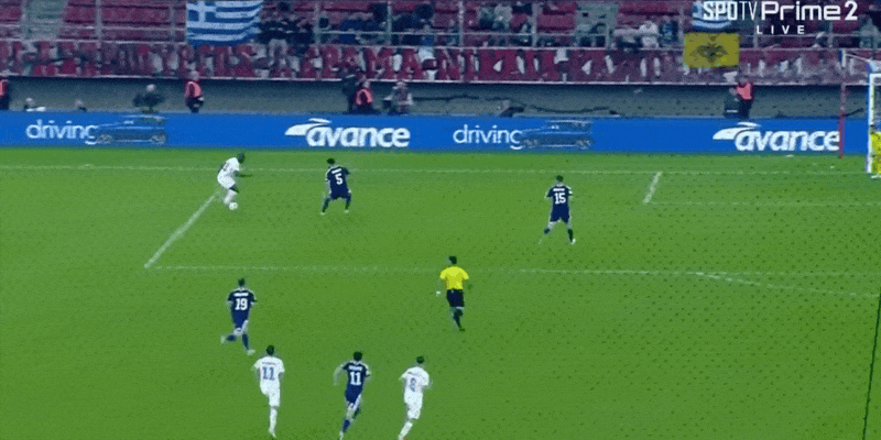 27' Hy Lạp nhận bóng từ vạch trên, Rezos lắc đầu sút trúng khung thành nhưng Gordon đã cản phá