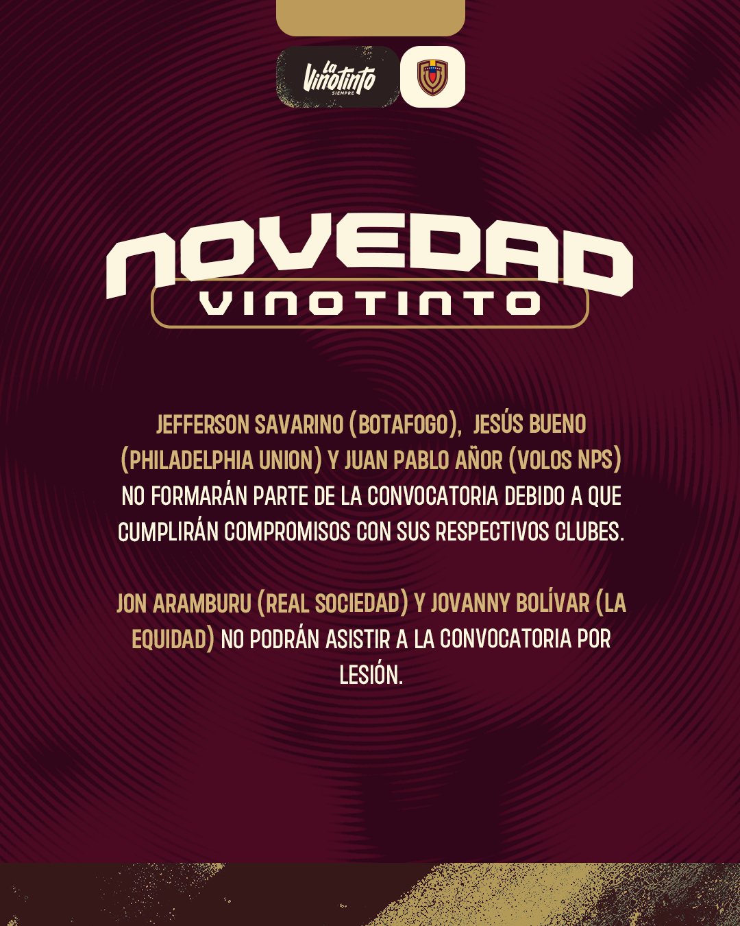 6686 Bản tin thể thao ngày 13 tháng 11 Đội tuyển quốc gia Venezuela chính thức thông báo rằng Savarino của Botafogo, Arno của Volos và Bueno của Philadelphia Union không thể đưa tin cho trận đấu cấp câu lạc bộ và bỏ lỡ trận đấu với Australia.
