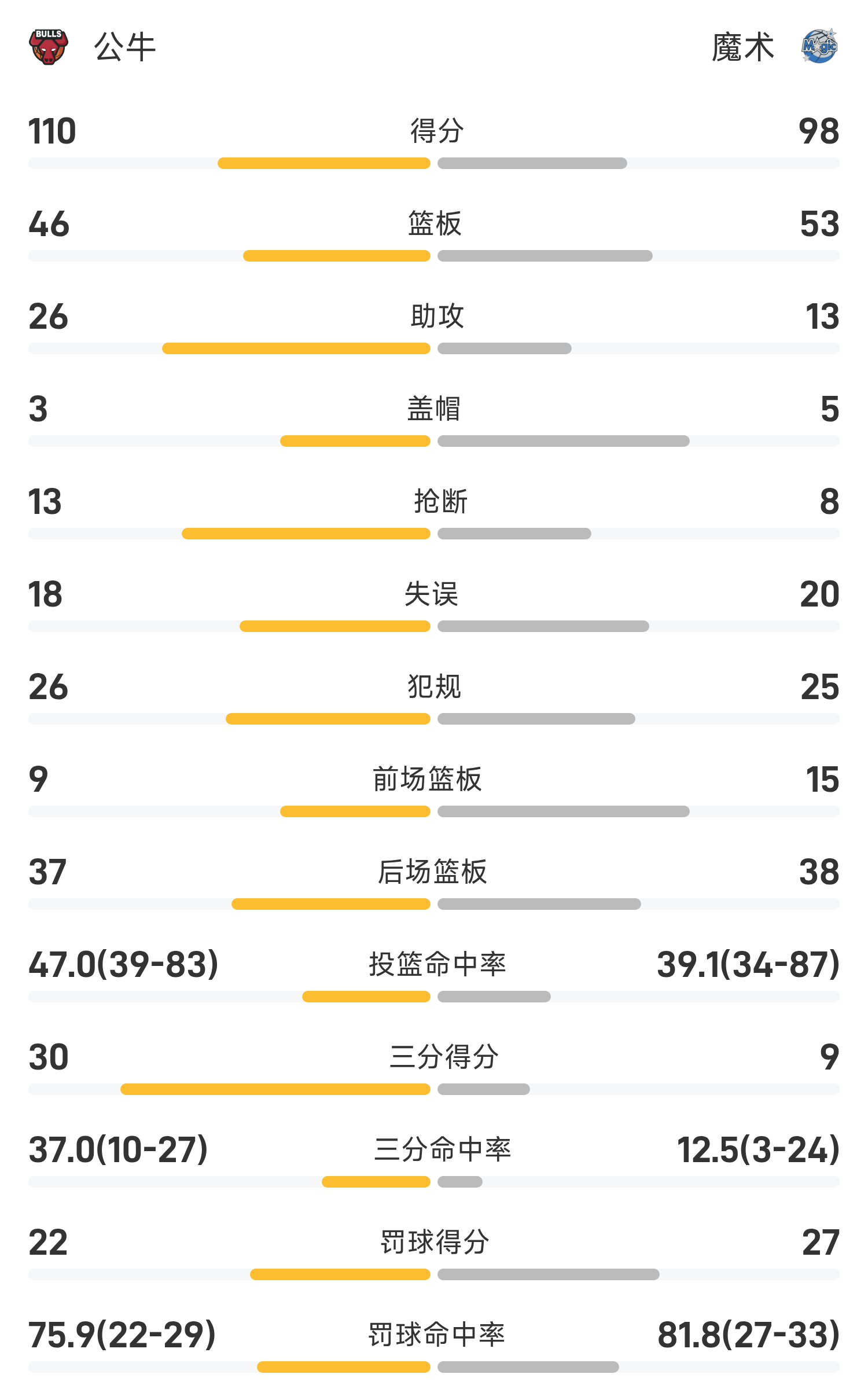 Cuối trận, Magic thua Bulls với tỷ số 98-110.