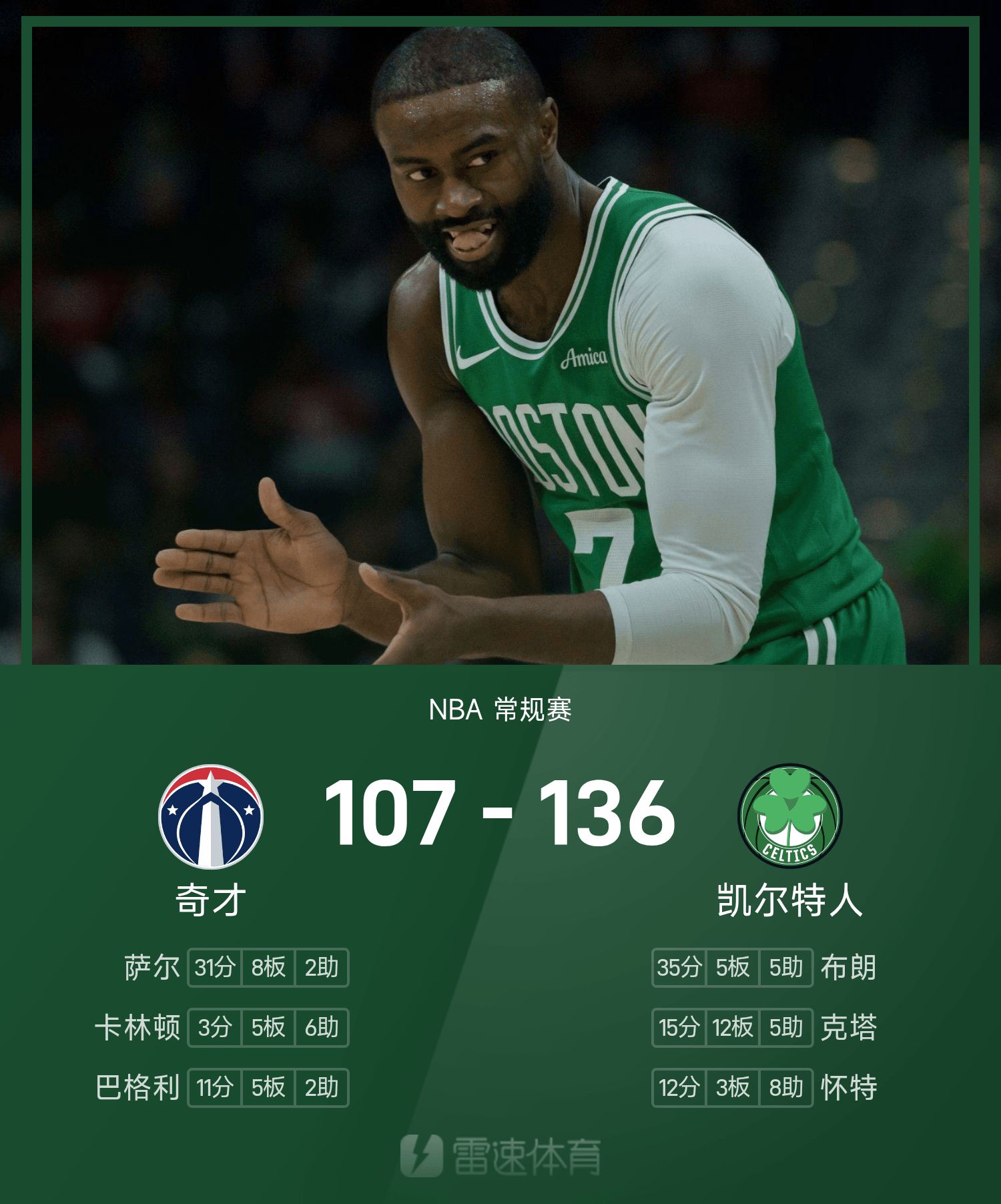 Jaylen Brown ghi được 35 điểm và 6 Celtics ghi được con số gấp đôi để đánh bại Wizards.