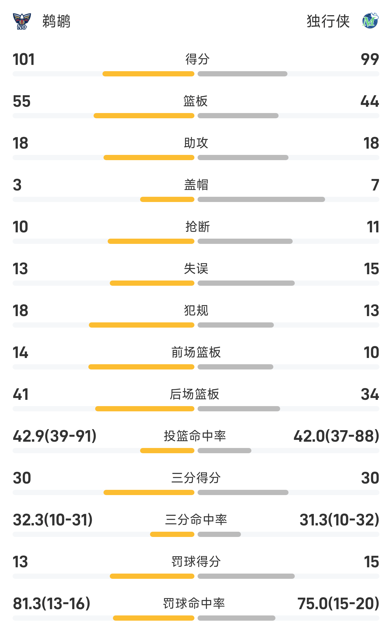 Cuối trận, Mavericks thua Pelicans với tỷ số 99-101.