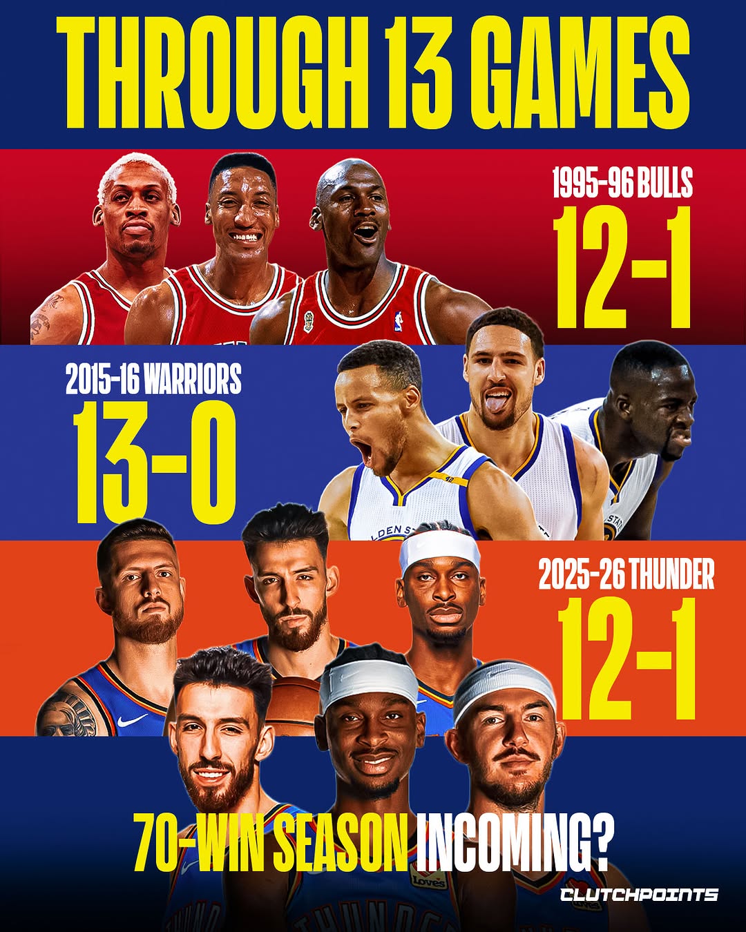 Thành tích mở màn mùa giải của Thunder có thể so sánh với Bulls năm 1996, và họ được kỳ vọng sẽ trở thành đội thứ ba có hơn 70 trận thắng.