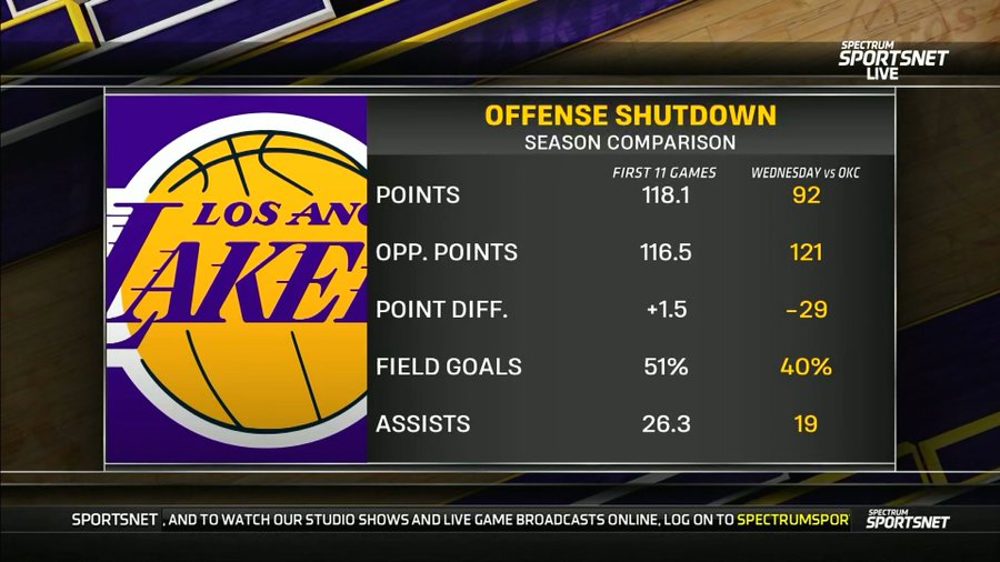 Sau trận đấu, các đài truyền hình Mỹ đã so sánh dữ liệu của Lakers trong trận đấu này với dữ liệu của 11 trận đầu tiên của mùa giải. Tất cả dữ liệu rơi trên bảng.